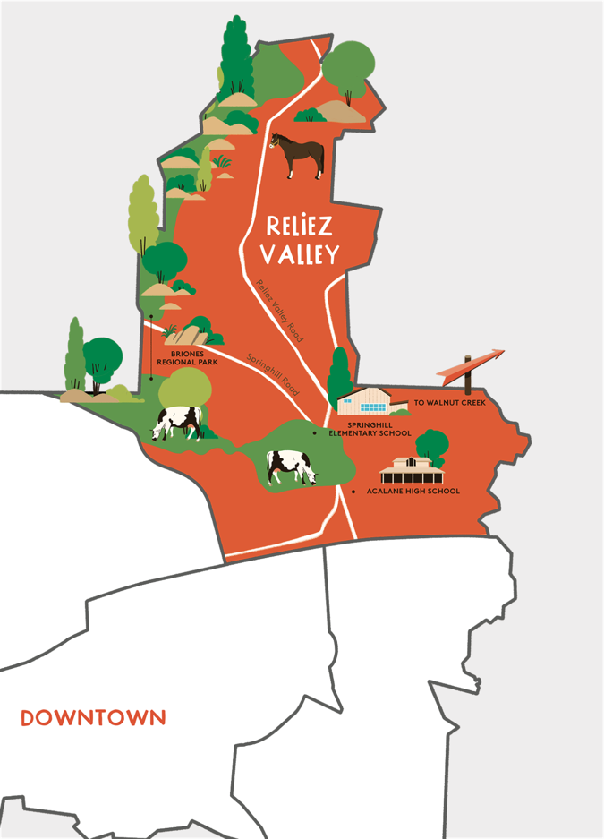 “Reliez Valley is Lafayette’s most rural neighborhood. It is nestled in the pastoral hills, dotted with cows and horse pastures. A major draw to this area is easy access to Briones Regional Park, scenic cycling routes, larger parcels of land, and the neighboring towns of Walnut Creek, Pleasant Hill and Martinez.” —Mary